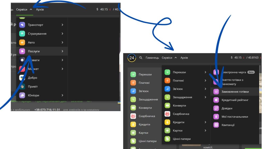 - Вибрати меню «Сервіси»: Перейдіть у розділ «Послуги – Замовлення готівки».