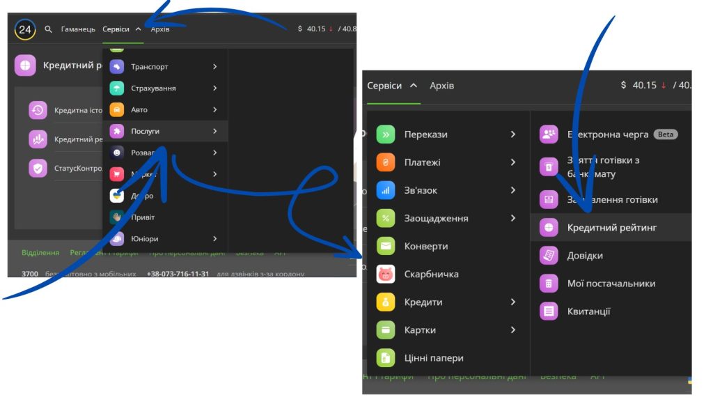 - Перейти в розділ «Сервіси»: У меню виберіть опцію «Кредитний рейтинг».