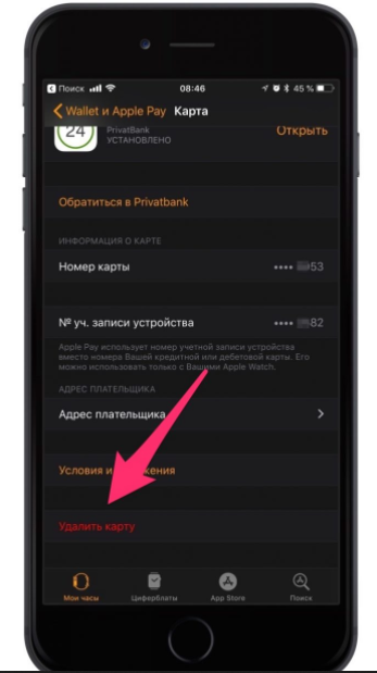 Для удаления карты из Apple Pay следует перейти в приложение «Кошелек», нажать на три точки в верхней правой части экрана, пролистать страницу вниз, и нажать на кнопку «Удалить карту».